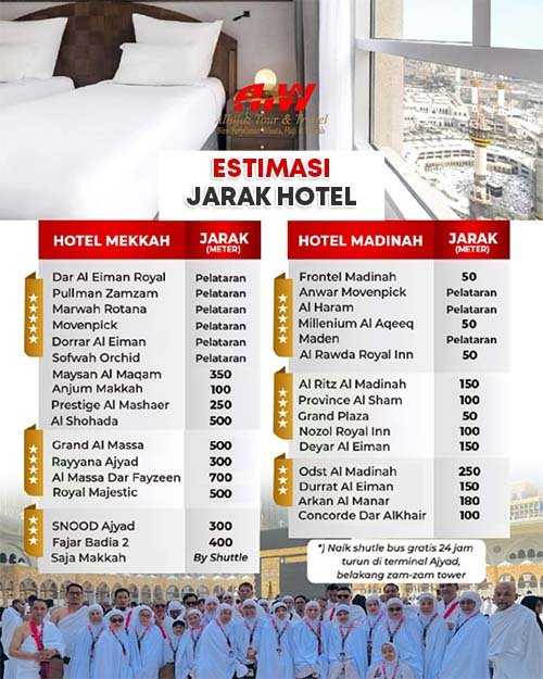 Hotel kami ada pada ring 1 dekat masjid baik di Masjidil Haram maupun di Masjid Nabawi. Hotel Berbintang 5 berada di kawasan Pelataran Masjidil Haram/Masjid Nabawi.